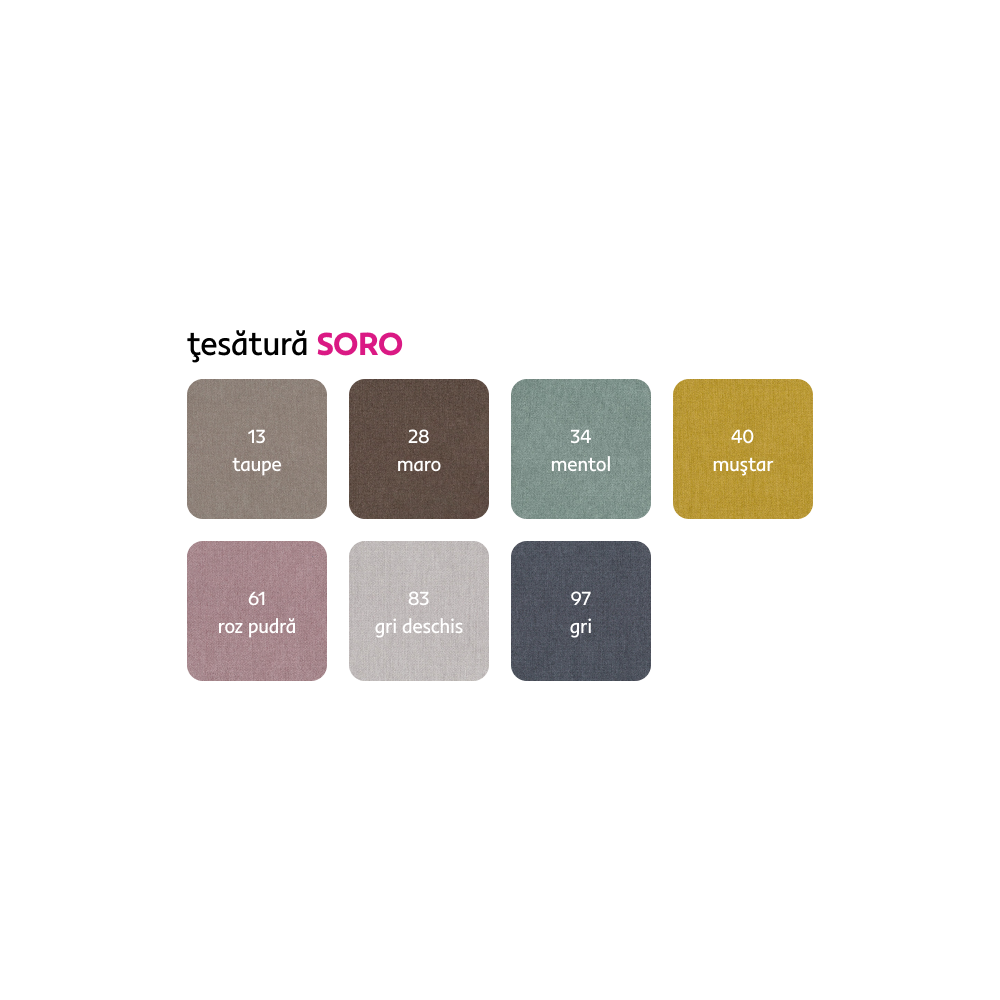 Posibilitatea de a comanda şi în alte modele de culori. Disponibilă în 7 modele a materialului textil Soro. Pentru o comandă individuală, este necesar să plătiţi un avans de 10% din sumă. După achitarea avansului, comanda dvs. va fi dată în producţie. Durata de livrare este între 14-18 săptămâni.