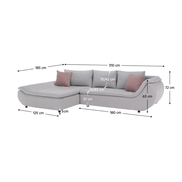 Material: ţesătură Soro 83/61 Rezistenţa ţesăturii conform testului Martindale: 90 000 – 100 000 de cicluri de frecare Culoare: gri deschis / roz pudră Dimensiuni (LxAxÎ): 310x185x72 cm Înălţime scaun: 37 cm Adâncimea scaunului cu perne: 55 cm Adâncimea scaunului fără perne: 83 cm Suprafaţa extensibilă pentru dormit (LxL): 135×240 cm Înălţimea spaţiului inferior de la podea: 5 cm Capacitate de încărcare: 90 kg Umplutura modulului pentru şezut: arcuri ondulate / spumă poliuretanică Variantă pentru partea stânga Tapiţată integral Cu spaţiu de depozitare Trei perne incluse în set Perne decorative incluse Livrată dezasamblată Vă oferim posibilitatea de a alege dintre 7 nuanţe de culoare ale ţesăturii Soro, conform catalogului de mostre. Vă rugăm să specificaţi alegerea dumneavoastră direct în notele din comandă. Preţul canapelei la comandă este de 5889,- . Pentru comenzi personalizate este necesară plata unui avans de 10% din suma totală. După achitarea avansului, comanda dumneavoastră va intra în producţie. Termenul de livrare este de 6-8 săptămâni.