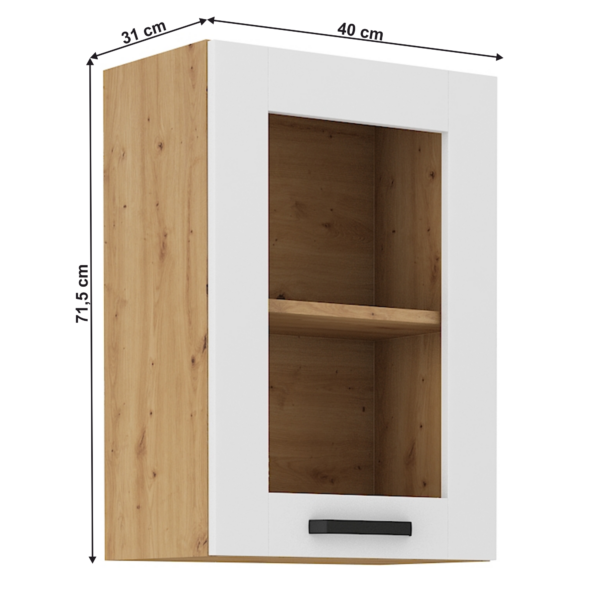 Dulap superior LULA 40 GS-72 1F Material: laminat HDF/MDF/sticlă Culoare: albă/stejar artisan Dimensiuni (LxAxÎ): 40x31x71,5 cm Grosime material: 1,6 cm Grosime uşă: 2 cm Uşă simplă, Cu geam, Cu raft, Cu mâner metalic, Culoare mâner: neagră, Sistem de închidere silenţioasă a uşii, Design dinamic modern, Livrat dezasamblat, Dulapurile inferioare sunt furnizate împreună cu şina inferioară, Fără blat de lucru. Opţiunea de a achiziţiona blat de lucru din stejar artisan sau marmură roma la preţul de 339,-/metru liniar. Opţiunea de a achiziţiona o chiuvetă universală LAY ON.