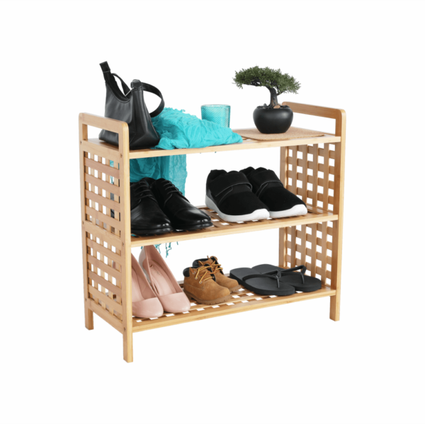 Dulap pt. Încălţăminte 3-poliţe , material: bambus lăcuit, culoare: bambus natural. Dimensiuni (LxGxÎ): 60×27,5×35 cm.