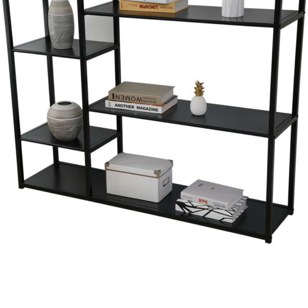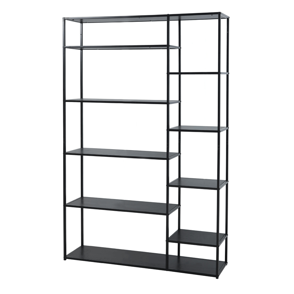 Material: metal Culoare: neagră Dimensiuni (LxAxÎ): 120x30x188 cm Înălţimea picioarelor: 1 cm Capacitate de încărcare pe fiecare raft: 10 kg Spaţiu de depozitare deschis Zece zone de depozitare Structură metalică Vă recomandăm să ataşaţi mobilierul de perete Livrată dezasamblată