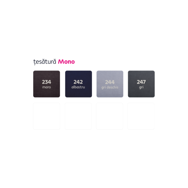 Posibilitatea de a cumpăra şi în alte modele de culori a materialului textil Mono la preţul de: 160×200 – 6.375 şi 180×200 – 6.659. Posibilitatea de a cumpăra patul şi în dimensiunea: 90×200 la preţul 3.799 sau 140×200 la preţul:6.149, livrare 6-8 săptămâni. Pentru o comandă individuală, este necesar să plătiţi un avans de 10% din sumă. După achitarea avansului, comanda dvs. va fi dată în producţie.