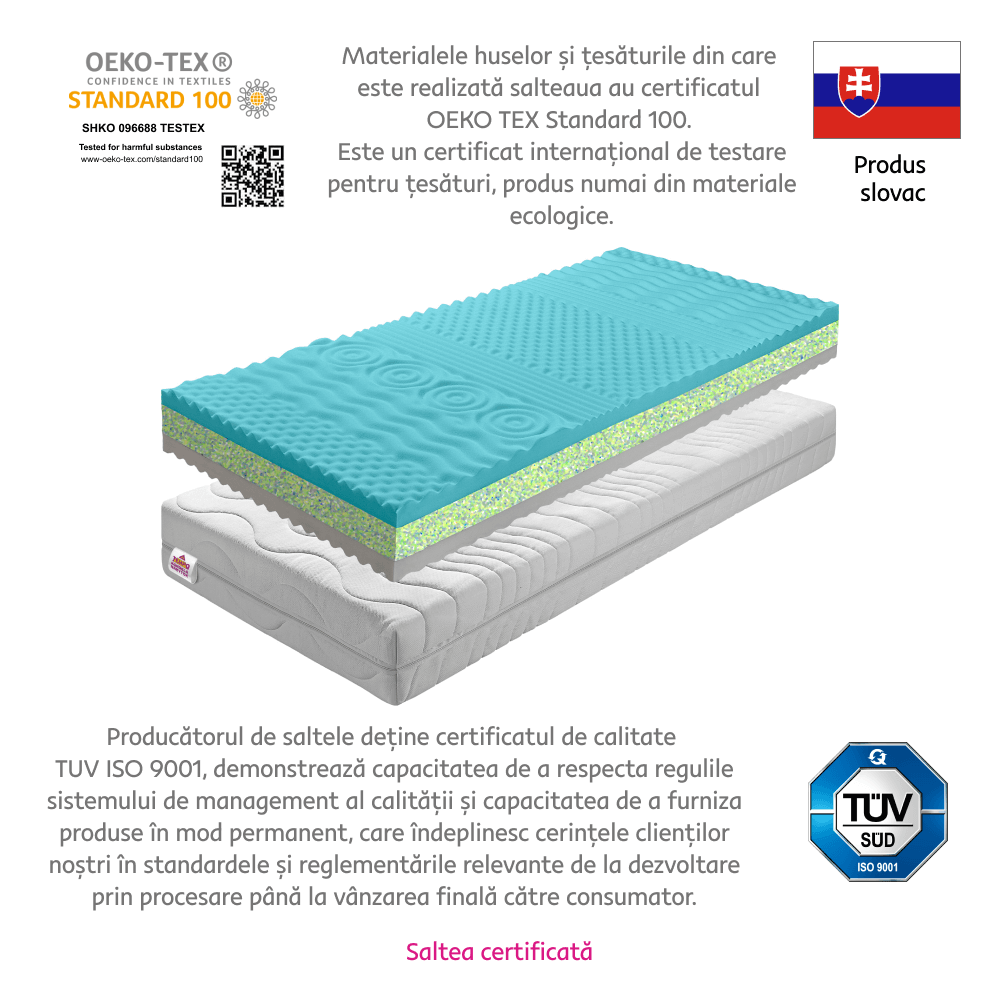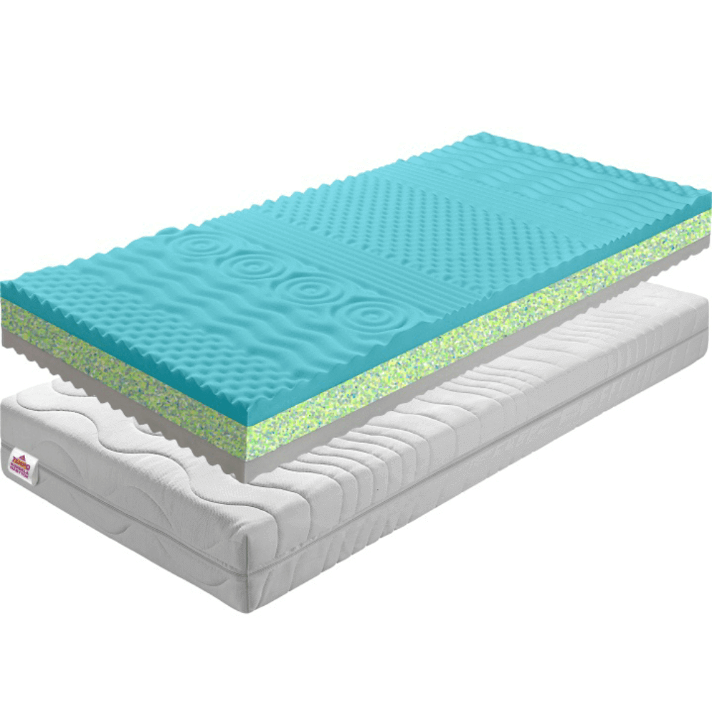 Saltea cu şapte zone de tip sandvici cu placă RE cu o grosime de 7 cm cu dimensiuni de la 80×200 cm la 180×200 cm. Straturile exterioare sunt realizate din spumă PUR de înaltă calitate. Salteaua are un punct central puternic consolidat. Are o rezistenţă ridicată, o capacitate crescută de încărcare şi o profilare anatomică. Husa este fabricată din material textil CHLOE AKTIV de înaltă calitate şi este detaşabilă. Înălţimea saltelei este de 14 cm. Vă recomandăm să cumpăraţi un grilaj fix sau reglabil pentru saltea. Capacitate de încărcare: 110 kg.
