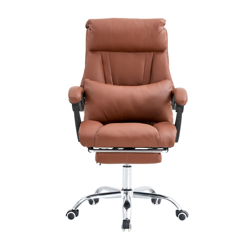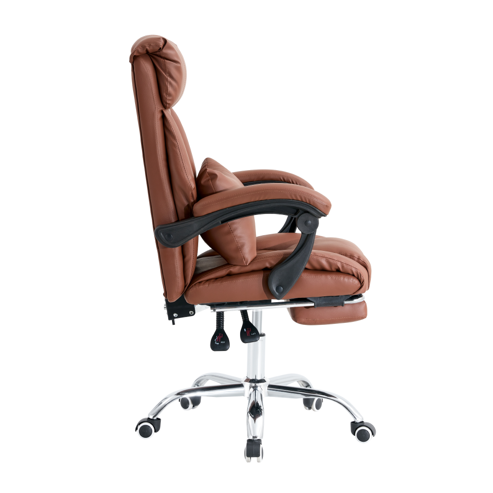 Material: piele ecologică / oţel Rezistenţa pielii ecologice conform testului Martindale: 100.000 de cicluri de frecare Culoare: maro / crom Dimensiuni (LxAxÎ): 64x67x104-114 cm Înălţime scaun: 45-55 cm Adâncime scaun: 51 cm Lăţime scaun: 51 cm Înălţime spătar: 64 cm Lăţime spătar: 55 cm Capacitate de încărcare: 110 kg Suport extensibil pentru picioare Se roteşte 360° Reglarea înclinării spătarului 90° – 135° Contur ergonomic Înălţime reglabilă a scaunului Cotiere din plastic tapiţate Bază cromată cu cinci spiţe Rotile universale Potrivit atât pentru pardoseli dure, cât şi moi Pernă în regiunea lombară Livrat dezasamblat