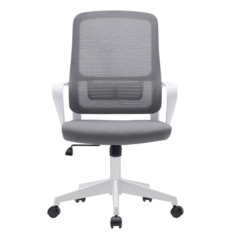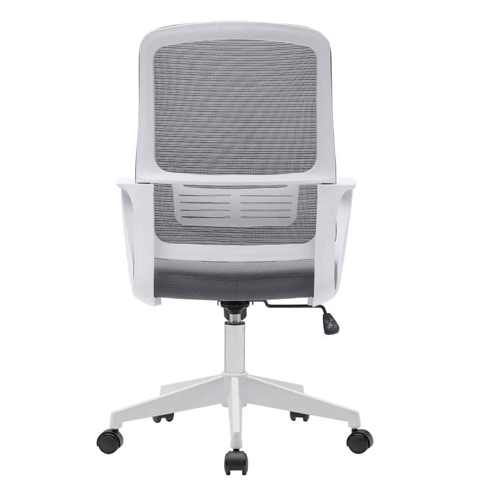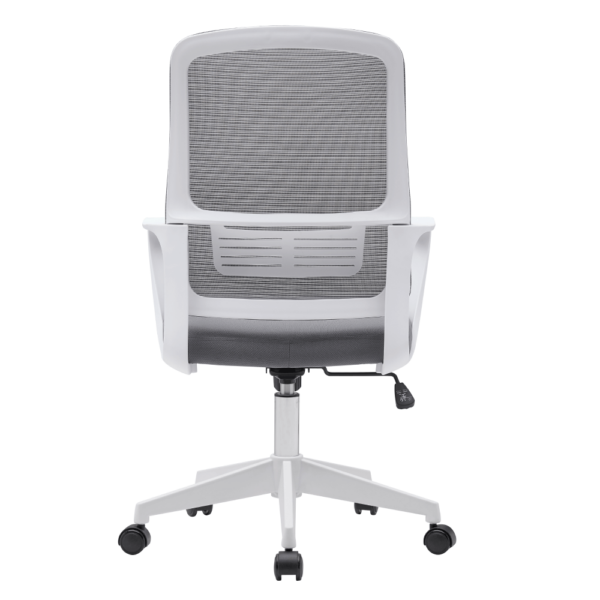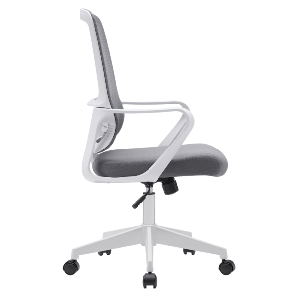 Material: plasă / material textil / plastic Rezistenţa plasei conform testului Martindale: 90.000 de cicluri de frecare Rezistenţa ţesăturii conform testului Martindale: 85.000 de cicluri de frecare Culoare: gri / albă Dimensiuni (LxAxÎ): 63×56,5×99-109 cm Înălţimea scaunului: 45-55 cm Adâncime scaun: 52 cm Lăţime scaun: 49,5 cm Înălţime spătar: 58 cm Lăţime spătar: 46,5cm Capacitate de încărcare: 100 kg Înălţime reglabilă a scaunului Bază din plastic cu cinci spiţe Rotile universale Potrivit atât pentru pardoselile dure, cât şi pentru cele moi Mecanism de balansare Livrat dezasamblat