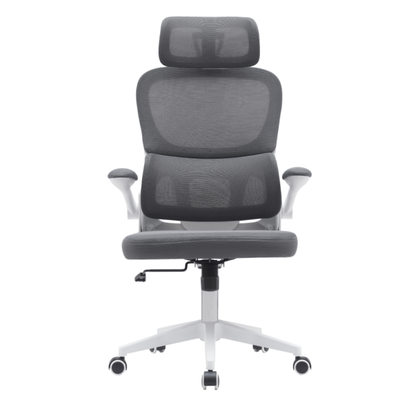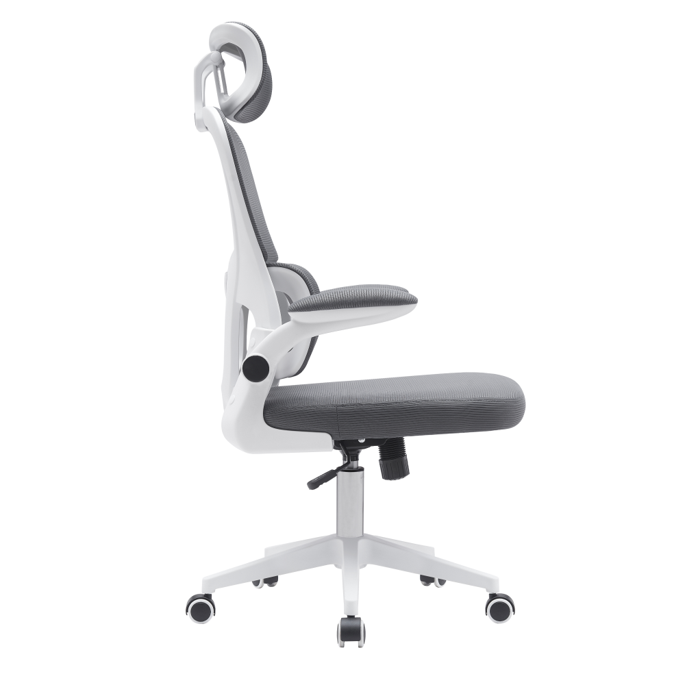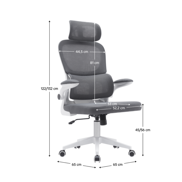 Material tapiţerie: plasă / plastic Rezistenţa plasei conform testului Martindale: 90.000 de cicluri de frecare Culoare: gri închis / albă Dimensiuni (LxAxÎ): 65x65x122-132 cm Înălţimea scaunului: 45-56 cm Adâncime scaun: 53 cm Lăţime scaun: 52,2 cm Înălţime spătar: 81 cm Lăţime spătar: 44,5 cm Capacitate de încărcare: 110 kg Cotiere tapiţate şi rabatabile Tetieră reglabilă Înălţime reglabilă a scaunului Bază din plastic cu cinci spiţe Rotile universale Potrivit atât pentru pardoselile dure, cât şi pentru cele moi Mecanism de balansare Livrat dezasamblat