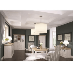 Mobilier pentru living WAW NEW. mas[ RTV, poliţă dublă, două dulapuri suspendate. Material PAL melaminat. Culoare stejar wotan/alb